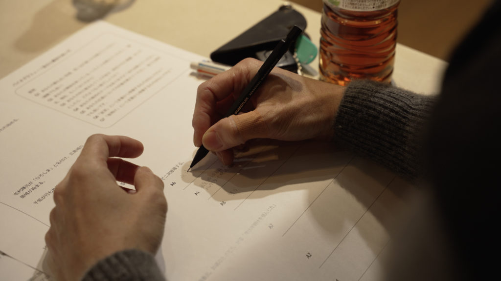参加者への7つの質問をし、用意された紙に記入してもらい個人の年表を作ってもらった。制作したものを元に、参加者間でそれぞれの為人や考えを知り、広島と個人の関係について意見交換を行った。